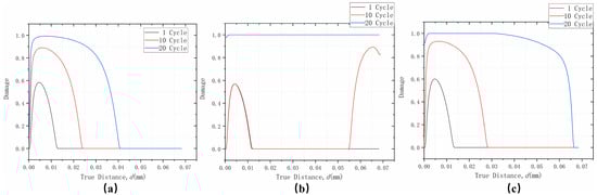 The interfacial cracking behavior due to different TGO growth modes after 20 thermal cycles is demonstrated in Figure 17 below. When only the growth in the TGO thickening direction was considered, the TC/TGO interface was damaged to a certain extent, but no cracks were found (the cracking behavior occurred when the damage reached 1). When the lateral growth of TGO was considered, substantial cracking occurred at the interface, and the degree of cracking in the valley area was much larger than that in other areas of the interface. When the non-uniform growth of TGO was considered, it was found that the cracking had occurred in the off-peak area. The macroscopic cracking behavior demonstrates the effect of different TGO growth modes on the interface. Non-uniform growth has a promoting effect on the interface cracking, while lateral growth will lead to substantial cracking of the interface.