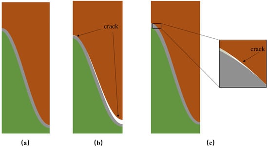 Interface cracking behavior after 20 thermal cycles considering: (a) uniform thickening growth; (b) thickening and lateral growth; and (c) non-uniform thickening growth.