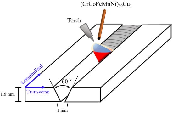 Schematic diagram of GTA welding process using Cu-coated HEA filler metal.