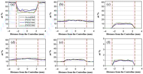 Figure 2 represents the quantitative behaviour of the elements along the centreline in the thickness for various PWHT temperatures. The red dotted lines indicate the fusion lines. The filler metal had a higher concentration of nickel (Ni), manganese (Mn), Co, chromium (Cr), and Cu and a lower iron (Fe) content than the BM. Due to dilution, therefore, the concentrations of Ni, Mn, Co, Cr, and Cu increased and that of Fe decreased in the WZ compared to those in the BM. A quantity of 1-at% Cu was properly mixed in the WZ (Figure 2f). No macro-diffusional behaviour of the component was observed concerning the PWHT temperature, indicating that the PWHT in the range of 700–900 °C was insufficient to significantly diffuse substitutional atoms.