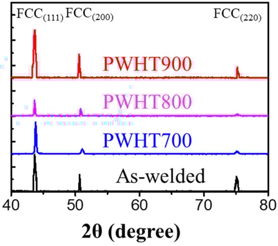 Figure 3 illustrates the phase identification using XRD in the WZ at various PWHT temperatures. The WZ exhibited only the FCC crystal structure, regardless of the PWHT temperature. Typically, the Cu-rich FCC phase, having the same crystal structure but a different lattice parameter compared to the primary FCC, would result in a double peak in the XRD pattern (that is, separation into secondary FCC). In addition, despite the positive mixing enthalpy of Cu and the anticipated clarity of the double peak with increasing PWHT temperature, no distinct double peaks were observed in the WZ, even at a PWHT temperature of 900 °C [9,23,26].