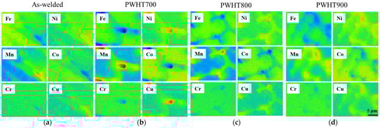 Figure 4 depicts the elemental maps of WZ at various PWHT temperatures, with the WZ exhibiting a dendritic microstructure. The interdendritic region was mainly segregated with Ni, Mn, and Cu, which have relatively lower melting temperatures than Fe and Co. Therefore, the interdendritic segregation region was determined to be the final solidification region (referred to as the Cu-rich region) rather than the Cu-rich phase. The content in the Cu-rich region was 2.0 ± 0.1, 2.7 ± 0.2, 2.2 ± 0.1, and 1.9 ± 0.1-at% Cu for as welded, PWHT700, PWHT800, and PWHT900, respectively. Theoretically, Cu possesses a positive mixing enthalpy with other elements (Fe, Ni, Mn, Co, and Cr) and tends to segregate from the primary phase in the thermally activated system [23]. In other words, an increase in PWHT temperature would result in a higher content of Cu in the Cu-rich region. However, the Cu content in the Cu-rich region was mostly consistent with increasing PWHT temperature. Through the EPMA analysis (Figure 3 and Figure 4), no clear Cu-rich phase (phase separation) was formed after PWHT. No phase separation in the interdendritic region was confirmed in the WZ, even though the 1-at% Cu in the filler metal was well mixed with the weld metal.