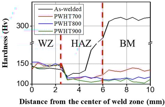 Figure 5 illustrates the hardness distribution in the transverse weld at various PWHT temperatures. As the BM was a cold-rolled ferrous MEA, the BM and CGHAZ of the as-welded specimens exhibited the highest and lowest hardness values, respectively. The CGHAZ was the most deteriorated region, where the grains grew because of the welding heat input [34,35]. The WZ and CGHAZ exhibited a consistent tendency for hardness regardless of the PWHT since they retained an as-welded microstructure without cold deformation. PWHT decreased the hardness of the BM by the annealing effect compared to that of the WZ and CGHAZ after PWHT. Furthermore, PWHT900 demonstrated the homogenised hardness in the CGHAZ and BM.