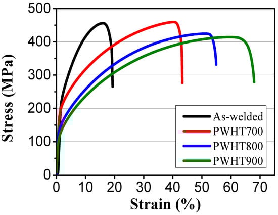 Figure 6 presents the stress–strain curves with respect to the PWHT temperatures. The average values of tensile strength for as welded, PWHT700, PWHT800, and PWHT900 were 455 ± 10.8, 450 ± 8.5, 424 ± 12.5, and 414 ± 13.8 MPa, respectively. The elongations of as welded, PWHT700, PWHT800, and PWHT900 were 19.3 ± 0.5, 43.3 ± 1.9, 54.9 ± 3.6, and 68.0 ± 0.8%, respectively. The tensile strength exhibited minimal variation, while the elongation significantly increased with increasing PWHT temperature.
