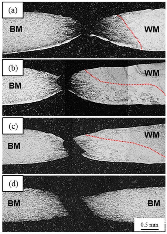 Figure 7 illustrates the morphology of the transverse and the fracture locations of each specimen after tensile testing. The red dotted lines indicate the fusion lines. The as welded, PWHT700 and PWHT800 alloys (Figure 7a, Figure 7b, and Figure 7c, respectively) exhibited fractures in the CGHAZ. However, in the case of PWHT900 (Figure 7d), the fracture occurred in the BM instead of the CGHAZ. PWHT900 demonstrated the best weldability of the transverse welds, characterised by large elongation, nearly the same tensile strength, and the prevention of fractures at the WZ and CGHAZ.