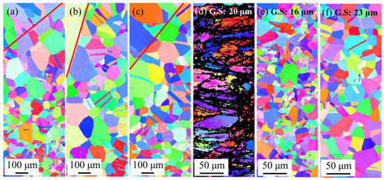 EBSD analysis with inverse pole figure (IPF) map in (a–c) CGHAZ and (d–f) BM with respect to the PWHT temperature: (a,d) as welded; (b,e) 800 °C; and (c,f) 900 °C.