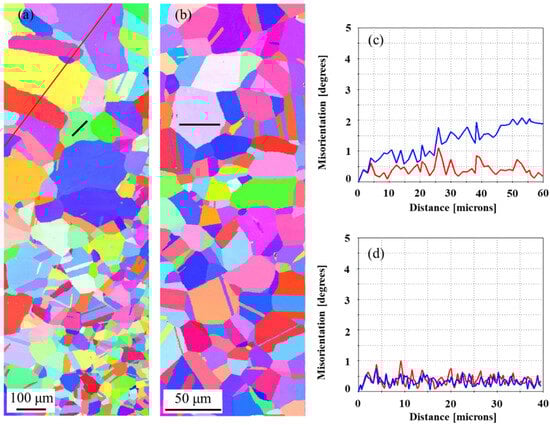 IPF map and corresponding misorientation profiles for the PWHT900 measured in various locations: (a,c) CGHAZ and (b,d) BM. (Red lines mean point to point and blue lines mean point to origin).