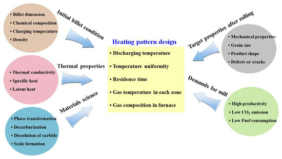 Based on the problems mentioned above and a literature review [2,11,12,13,14], the heating pattern of a billet needs to be designed from the perspectives of both thermal engineering and materials science. Based on the experiences of the author, the heating behaviors of carbon steels and austenitic stainless steels (STSs) were different despite their similar heating patterns. In a similar heating pattern, it was observed that the STSs were heated quickly as a whole heating stage and the temperature uniformity for each region of a billet was high when the billet was discharged. The author believes that these phenomena are closely related to the thermal properties of the steel because carbon steels and STSs have different thermal properties [15,16]. For example, Peet et al. [15] predicted and compared the thermal conductivity (k) of carbon steels and STSs based on the neural network technique. They showed that the k of carbon steels was much higher than that of STSs, indicating that the thermal behavior of two groups of steel was different during heating or cooling. These results suggest that the heating pattern should be different depending on the thermal properties of steels. Figure 1 summarizes the design factors affecting the heating pattern of an industrial rolling mill.