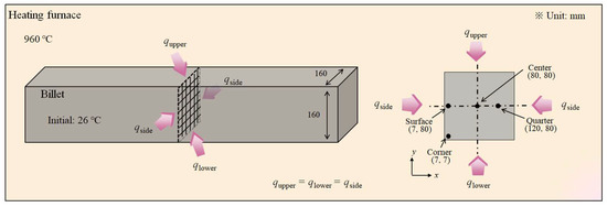 Tg is 960 °C throughout the study and varies depending on the gas temperature settings in Section 3.3. The small influence of convective and conduction heat transfers and several geometric factors for radiative heat transfer can be considered by using φ. In other words, the φ used in this study was a tuning parameter depending on several factors. We can predict the temperature distribution of the billet with the low computational cost and time when φ is accurately determined [3,4,5] compared with the 3D CFD analysis. In industrial fields, therefore, many hot rolling mills use these types of models to predict the temperature distribution of the billet in the reheating furnace. The disadvantage of this approach is that temperature measurement tests are strongly necessary to confirm and/or modify the φ values. The gas temperature around the billet in the furnace was assumed to be constant in this study. Therefore, qt in Equation (4) was assumed to be the same on the four sides of the billet, as shown in Figure 1. That is, the upper, lower, right, and left sides of the billet had the same heat flux and φ value.