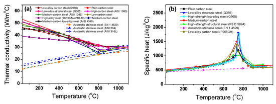 The k and cp of the billet are dependent on the temperature. In this study, the k and cp of the billet were obtained based on the results of the literature review. Figure 3a,b show the k and cp of the steels with temperature from several Refs. [17,18,19,20,22,26,27,28,29,30,31,32,33].