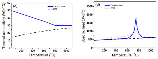 An abrupt change in the thermal properties appeared in the carbon steels due to the structure changes of the steels from the body centered cubic (BCC) to face the centered cubic (FCC) structures [29,34]. In carbon steels, k tends to decrease with an increasing temperature. In the case of the STS, k gradually increases with temperature. It is known that the thermal properties of metals vary with the composition, grain size, and cold deformation of the metal [35]. In this study, an alloyed medium-carbon steel (AISI 4137) and austenitic stainless steel (SUS304) were adopted for the test metals because it is widely used in wire, rod, and bar products. The average thermal properties of plain carbon steels and STSs were used as shown in Figure 3c,d, because this study mainly focuses on the effect of thermal properties on the temperature distribution of the billet during the heating process. The k and cp were numerically implemented in Equation (1) as a function of temperature. Meanwhile, the density of the steel billets was assumed to be constant at 7850 kg/m3 [36,37].