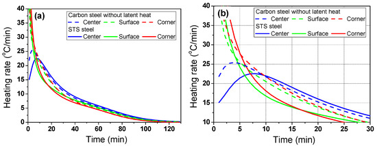 Comparison of the heating rate of the billet between the carbon steel without latent heat and STS with the region: (a) full and (b) initial ranges.