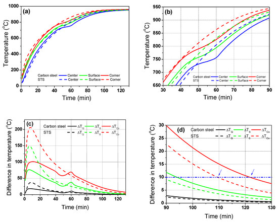 At the initial stage of heating, the temperature deviation of the STS was higher than that of the carbon steel (Figure 7c) owing to its lower k. However, the temperature deviation of the carbon steel was higher than that of the STS when the phase transformation occurred in the carbon steel. Figure 7d compares the temperature deviations between the carbon steel and STS at the final stage of heating. If the acceptable temperature deviation along the thickness direction of the billet is 10 °C, we can reduce the residence time of the billet when using STSs. In other words, the residence time of the STS was approximately 110 min and that of the carbon steel was approximately 122 min, which means that the phase transformation increased the temperature deviation of the billet in the later stage of heating, leading to an increase in the residence time.