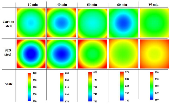 Figure 8 shows a comparison of the temperature contours of the billet between the carbon steel and STS as a function of residence time. As mentioned above, the temperature deviation of the STS billet was higher in the initial heating stage, and that of the carbon steel billet was higher after the phase transformation.