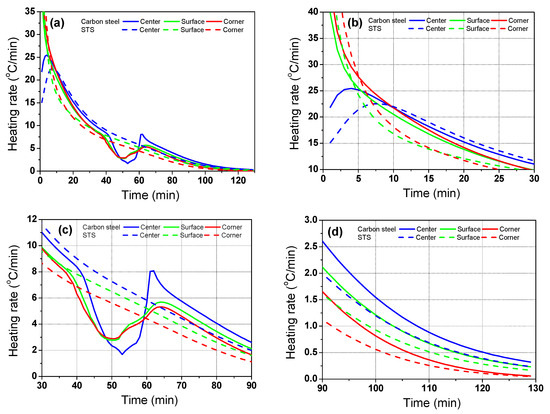 Comparison of the heating rate of the billet between the carbon steel and STS with the region: (a) full; (b) initial; (c) phase transformation; and (d) final ranges.