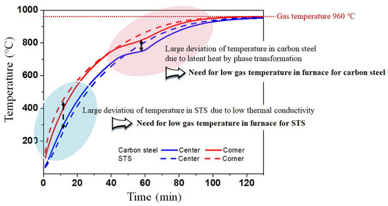 Overall, as summarized in Figure 10, the temperature deviation of the billet increased with decreasing k owing to the low conductive heat transfer within the billet, especially in the initial stage of heating owing to the higher radiative heat transfer from the gas/wall in the furnace to the surface of the billet. It means that we should decrease the gas temperature in the initial heating stage or preheating zone in a reheating furnace when heating the billet with low k such as STS and high-alloyed steels. Meanwhile, the temperature deviation of the carbon steel increased after the phase transformation. The phase transformation of steels generally occurred in the billet temperature range of 700 °C–800 °C, indicating that we should decrease gas temperatures in a reheating furnace in this temperature range of the billet. In summary, the different heating patterns are strongly necessary for carbon steel and STS billets.