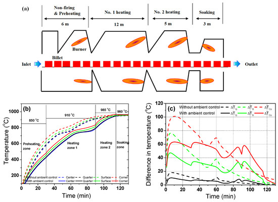 (a) Schematic description of arbitrarily designed walking-beam type reheating furnace for STS. Comparison of the (b) temperature profiles and (c) temperature differences of the STS with and without gas temperature control in the furnace. The temperatures presented in (b) indicate the gas temperatures of each zone in the reheating furnace.