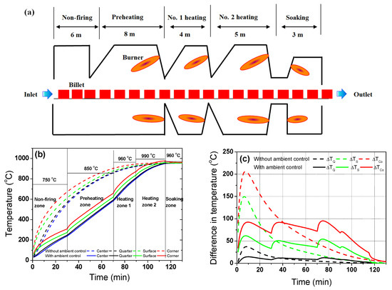 Since k of the STS was relatively low, the preheating zone or non-firing zone needed to decrease the temperature deviation of the STS billet in the initial stage of heating. For example, a low gas temperature was applied at the non-firing zone and preheating zone, as listed in Table 1. The temperature deviation within the region in the billet was dramatically reduced by applying a low gas temperature in the initial stage of heating the STS, as shown in Figure 12b,c.