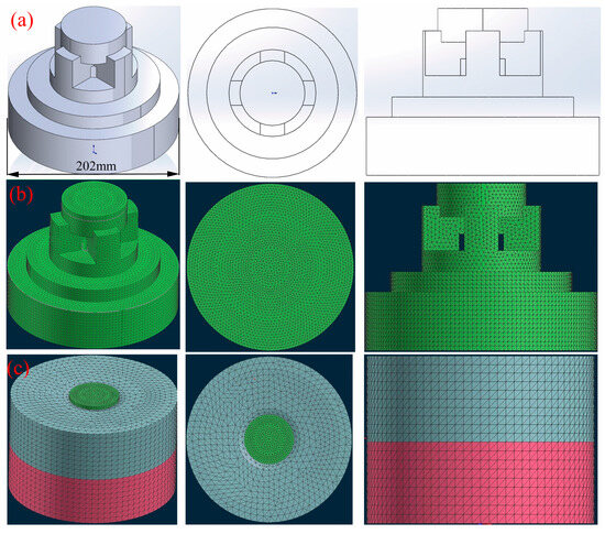 Three-dimensional model diagrams of TC4 wheel hub: (a) geometric model; (b) mesh model; (c) mesh model. The blue part of the figure shows the upper mold, the red part is the lower mold, and the green part is the casting of the hub.