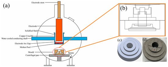 Schematic diagram of (a) vacuum self-consuming electrode arc shell condensing furnace, (b) the casting mold, (c) the mold of wheel hub, (d) As-cast Ti-6Al-4V wheel hub.