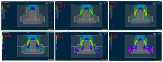 Velocity field of numerical simulation at different times of the filling stage for the Level 5 (R225M400P1750): percentage filled of 9.6 (a), 19.7 (b), 32.2 (c), 41 (d), 70.1 (e), and 98.1 (f).