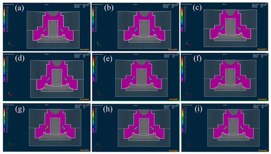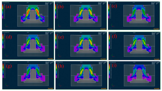 When the filled percentage was approximately 85%, the simulated velocity field of the wheel hub under all experimental protocols was shown in Figure 4. It could be observed that the unfilled area of the wheel hub was mainly concentrated in the middle area near the molds, probably due to the rotational speed. The effect of mold preheating temperature and rotational speed on the velocity field could be observed through the comparison of Levels 1, 2, and 3 (Figure 4a–c). It could be seen that the maximum velocity of the liquid metal increased, and the unfilled area closed to the inner mold expanded as the mold’s preheating temperature and rotational speed increased. Compared to Levels 1, 5, and 9 (Figure 4a,e,i), it could also be seen that the maximum velocity of the liquid metal increased with the increased rotational speed and pouring temperature, and the unfilled area near the inside of the mold expanded. In addition, there was no significant change under the maximum rotational speed among Levels 2, 5, and 8 (Figure 4b,e,h). It indicated that the rotational speed as a main factor affected the maximum velocity of liquid metal. That is to say, the defect distribution of the wheel hub could be affected by the velocity field of the liquid metal. Although high rotational speed increased the filling rate of liquid metal, too high of a rotational speed could significantly increase the content of inclusions in liquid metal [20], which was not conducive to the casting quality.