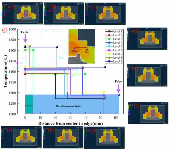 Temperature field of numerical simulation at 160 s and temperature graph of casting sample from center to edge: (a) Level 1: R200M400P1730, (b) Level 2: R225M450P1730, (c) Level 3: R250M500P1730, (d) Level 4: R200M500P1750, (e) Level 5: R225M400P1750, (f) Level 6: R250M450P1750, (g) Level 7: R200M450P1770, (h) Level 8: R225M500P1770, (i) Level 9: R250M400P1770. (j) Wheel hub temperature graph of high-temperature regions.