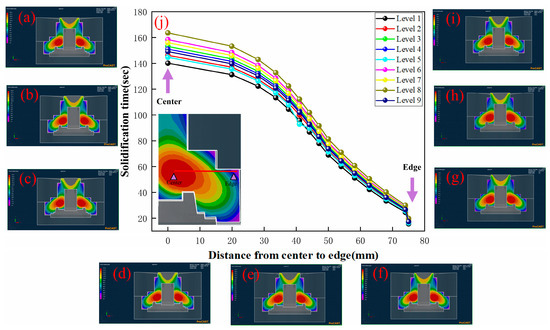 Solidification time of numerical simulation: (a) Level 1: R200M400P1730, (b) Level 2: R225M450P1730, (c) Level 3: R250M500P1730, (d) Level 4: R200M500P1750, (e) Level 5: R225M400P1750, (f) Level 6: R250M450P1750, (g) Level 7: R200M450P1770, (h) Level 8: R225M500P1770, (i) Level 9: R250M400P1770. (j) Solidification time of the sample from center to edge.