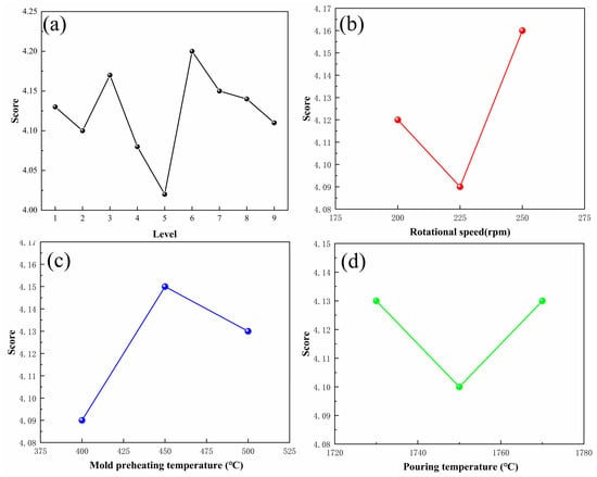 The statistical chart of scores in orthogonal experiment. Statistical chart of (a) total shrinkage porosity, (b) rotational speed, (c) mold preheating temperature, and (d) pouring temperature.