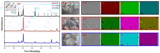 All three locations of the wheel hub exhibited large β grain in Figure 10b–d. During the solidification process, the lath α phases precipitated in the β grain, as shown in Figure 10b′–d′. It could be observed that the α grain orientation of three samples displayed obvious differences. The α grain orientation of PI and PO samples were parallel, while the PM sample was different. The lath α phase displayed disconnectedness, which would be in favor of improving the mechanical properties of the sample. Moreover, the Ti, Al, and V elements were uniformly distributed on the sample surface for all three samples [33].