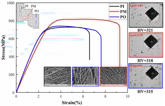 The stress–strain curves, fracture morphology, and hardness of the wheel hub, prepared according to Level 5, were analyzed in Figure 11. It could be observed that the tensile strength of the PM sample displayed a maximum value of 820 MPa compared with the PI and PO samples. The reason could be as follows: (1) PI and PO samples were perpendicular to the radial of the wheel hub, while PM samples were parallel to the radial of the wheel hub. (2) The difference in microstructure morphology of the α phase. The fracture morphology of the PM sample was dominated by uniformly distributed dimples with similar sizes. These dimples exhibited clear characteristics of ductile fracture. In contrast, the PI and PO samples showed an uneven distribution of dimples and even more tearing edges. Therefore, the tearing edges and nonuniform dimples corresponded to worse mechanical properties. This finding was consistent with the observation that the PI and PO samples had lower mechanical properties compared to the PM sample [34,35].