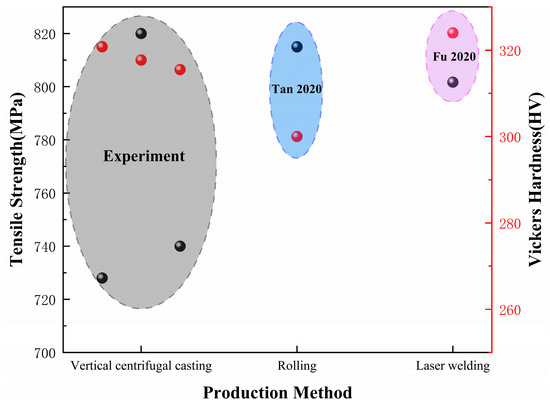 The mechanical properties of the TC4 alloy prepared by the rolling method [38] and laser welding method [39] were compared with the TC4 wheel hub prepared by the vertical centrifugal casting method in Figure 12. It could be observed that the tensile strength of the vertical centrifugal casting reached 820 MPa, which was higher than that of rolling (815 MPa) and laser welding (800 MPa). Similarly, the Vickers hardness of the TC4 wheel hub (320 HV) was higher than the rolling (300 HV) and close to the laser welding (324 HV) sample. Therefore, the above analysis indicated that the TC4 wheel hub prepared by the vertical centrifugal casting method exhibited excellent mechanical properties.