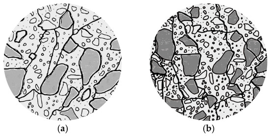Figure 1. Alkali–aggregate reaction cracking pattern: (a) ASR from the reactive sand; (b) ASR from the reactive coarse aggregate. Adapted from [22].