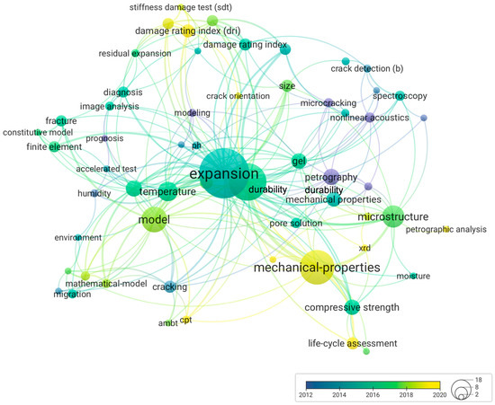 In the subsequent period (2014–2016), there was a notable inclusion of “image analysis” alongside the implementations of multi-level assessment techniques, including the “stiffness damage test” (SDT) and “damage rating index” (DRI). Besides the diagnosis, “finite element modeling” and “residual expansion tests” became apparent in 2016–2018, indicating a first move toward the future behavior of affected structures. This trend was further enhanced as indicated by a strong connection between “concrete microstructure” and “mathematical models,” suggesting a more analytical approach to ISR understanding and forecasting.