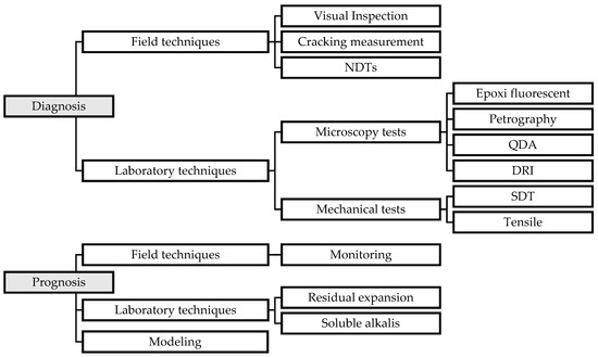 By summarizing the bibliometric analysis, Figure 4 categorizes the observed methodologies into diagnosis and prognosis phases, providing a structured overview of the main methods employed in the assessment of ISR-affected structures. The diagnosis includes field techniques such as visual inspection, cracking measurement, and NDTs. This extends to laboratory analysis involving microscopic (i.e., epoxy fluorescence, petrography, quantitative damage analysis—QDA, DRI) and mechanical tests (i.e., SDT and tensile). For prognosis, the categories are divided into field techniques (i.e., monitoring), laboratory techniques (i.e., residual expansion and soluble alkalis), and modeling.