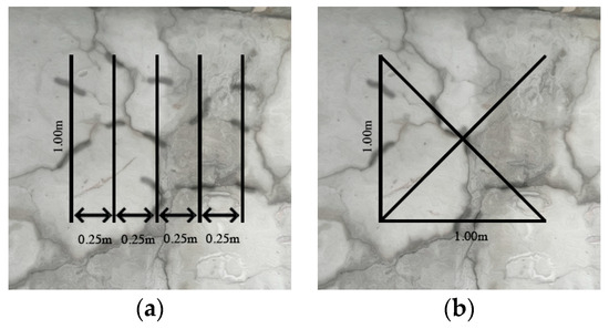 As shown in Figure 5a, this method involves a systematic approach to measuring cracks. It requires summing the widths of all cracks that intersect five straight lines, which are one meter in length each and spaced 0.25 m apart. After measuring, the severity of the damage is then categorized into one of five distinct levels, providing a structured assessment of the crack impact.