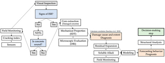 - The flowchart proposed in this study may serve as a guide for diagnosis and prognosis for ISR-affected structures. Yet probabilistic approaches may establish limits and refine the protocol.
