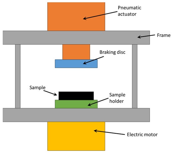 The test equipment consisted of a frame on which a pneumatic cylinder, a braking disc, and a specimen holder were fitted. The pneumatic cylinder had a diameter of 160 mm and a stroke of 100 mm, and it was actuated and controlled by an electronic pneumatic system in order to ensure the desired contact force between the sample and the braking disc. This latter was connected to the pneumatic cylinder, while the specimen holder was connected to an electric motor and rotated at 420 RPM. The holder was made of Bakelite to reduce the effects of heat dissipation through contact with the brake actuating systems. A schematisation of the test equipment is shown in Figure 1.