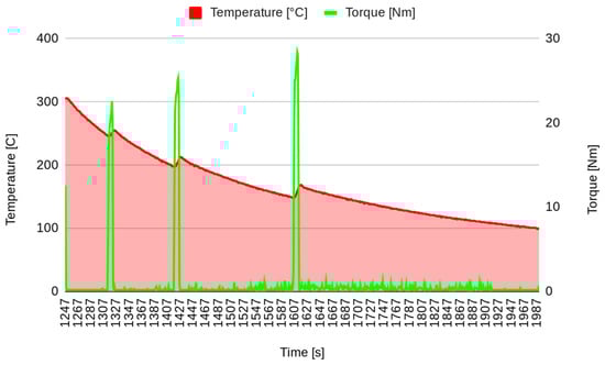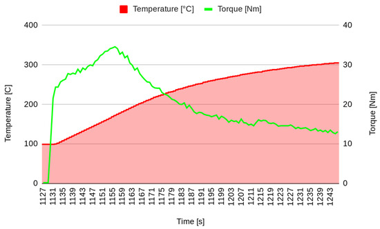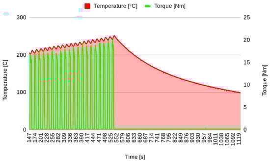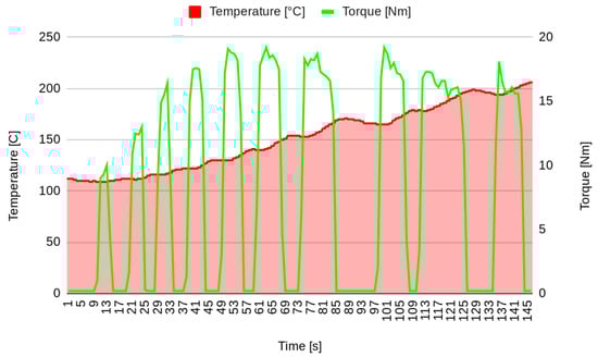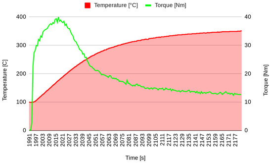 The data considered in this analysis are the temperature (T) and the friction (F) collected at the same instants after a preparation phase in which the brakes were stressed with braking and cooling actions. Figure 9 shows a representation of the increasing temperature, whereas the variation in friction is presented in Figure 10.