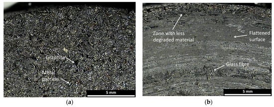 The different morphology of the pad constituents before testing can be seen on the pad surface. In Figure 8a, the darker zones represent the components that work at low temperatures, while the clearer ones represent those that work best at high temperatures. A comparison of the pad surface before and after the test (Figure 8) evidences the damage to elements working at low temperatures, which are flattened on the centre of the pad. Along the external zones, the surfaces seem to be similar to the untested surfaces. This suggests a greater expulsion capacity of degraded material due to the elimination of debris during braking. In the central zone, it is possible to note the presence of a glass fibre.