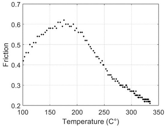 The behaviour indicated an increase in the friction coefficient from 0.4 to 0.6 in the 100–180 °C range and a decrease to 0.2 at high temperatures (300 °C).