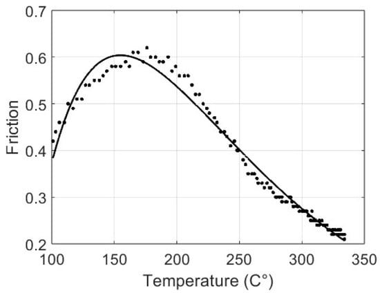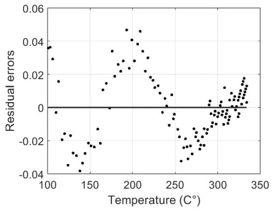 The sum-of-squares error is 0.041, with a root mean square error of 0.018. In Figure 13, the graph of the residual errors is shown; note the higher values at about 200 °C. These results attest to the capacity of the proposed model to anticipate the friction coefficient based on temperature data, even if a slight inaccuracy can be noted at lower temperatures.