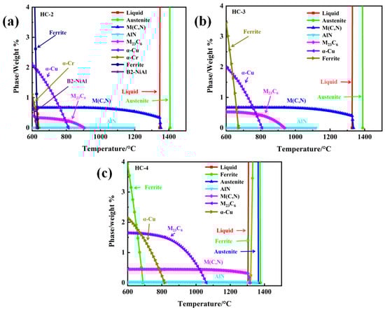 JMatPro calculation results of the HC series alloys: (a) HC-2; (b) HC-3; and (c) HC-4.