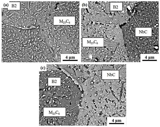 In Figure 3, compared with the HC-2 alloy, the content of the secondary NbC phase in HC-4 alloy and HC-3 alloy decreased in turn, which indicated that the precipitation of secondary NbC phase in AFA steel could be inhibited by replacing Ni with Mn. All phases in Figure 3 were identified by selected area diffraction. As mentioned above, the Mn-substituted Ni promotes the precipitation of a large number of M23C6 phases at the grain boundaries, enriching C elements at the grain boundaries and thereby inhibiting the precipitation of secondary NbC phases in the grains [23]. It is worth noting that α-Cu/NbC in Figure 3 represents α-Cu precipitate phase and a secondary NbC phase. Cu-rich precipitates usually nucleate on ultra-fine carbides [30]. In conclusion, Mn-substituted Ni in AFA steel can promote the precipitation of the M23C6 phase, inhibit the precipitation of the B2-NiAl phase and secondary NbC phase, and has little effect on the α-Cu phase. The co-effect of Mn-substituted Ni, the Cu content, and of Nb/C ratio on the precipitation behavior of different phases is an interesting topic worth investigating in Mn-added AFA steels.