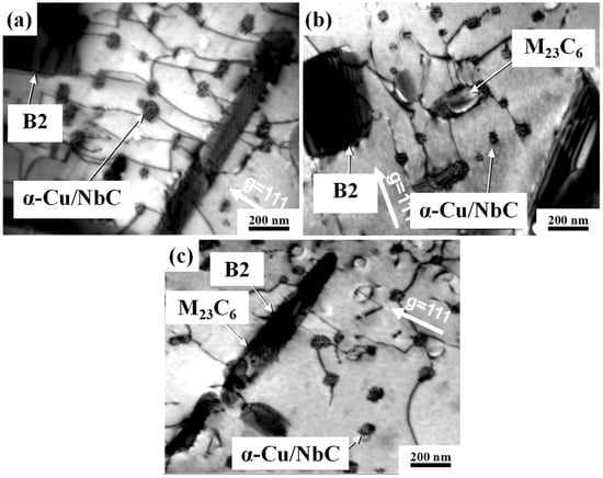In order to further confirm the effect of Mn substituting Ni on the precipitates of AFA steel, the microstructure of HC series alloys after creep fracture at 750 °C/100 MPa was analyzed, as shown in Figure 2 [20]. It can be seen that the HC-2 alloy has a lot of needle-like B2-NiAl phase both in the grain and at the grain boundary, but little M23C6 phase can be found [28]. By comparing with HC-3 alloy, it can be seen that with the increase in Mn content and the decrease in Ni content, the B2-NiAl phase in the grain boundary and grain interior obviously decreased, and the M23C6 phase content increased obviously. With the further increase in Mn content and the further decrease in Ni content, the content of B2-NiAl phase in HC-4 alloy was further decreased, and a large amount of M23C6 phase precipitated at the grain boundary and within the grain. This is consistent with the calculation results of JMatPro. The Cu-rich phase is also an important strengthening phase in austenitic steels. The size of the secondary NbC and α-Cu phases is both at the nanometer level, as shown in Figure 3. It was reported that the addition of Cu has a significant promoting effect on the precipitation of NiAl phase [29]. It is interesting to further clarify the promoting effect of Cu and the inhibitory effect of Mn on the precipitation of the NiAl phase in Mn-added AFA steel.