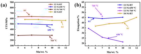 In order to analyze the effect of the Mn addition on the tensile properties of AFA steels, the content of Mn was increased on the basis of 8OC-I (12Ni-5Mn-0.2C), and the tensile data at room and high temperature were tested, as shown in Figure 4 [21]. On the basis of 10Ni-6Mn steel, the Mn content was sequentially increased to 10 wt.%, and room temperature (RT) tensile data were tested, as shown in Figure 4 [22]. The tensile strength of both 12Ni and 10Ni experimental steels slightly decreased with the increase in Mn content. The ultimate tensile strength (UTS) of 10Ni experimental steel decreased from 582 MPa slightly to 566 MPa. This indicates that, although the B2-NiAl and NbC phases precipitate decreased along with the increase in Mn content, a large number of M23C6 phase precipitated at the grain boundary and within the grain, which complemented the strengthening effect and maintained the ultimate tensile strength [31]. The UTS of 12Ni experimental steel decreased with the increase in the test temperature, which is because the thermal activation promotes the dislocation movement at high temperature, and the dislocation can more easily bypass the pinning action of precipitates by climbing and cross-sliding [32]. In Figure 4b, with the increase in Mn content, the room temperature elongation of 12Ni experimental steel decreased at first and then increased, which is consistent with the complementary strengthening effect of precipitates. And the room temperature elongation of 10Ni steel increased from 37% to 45%, which was due to the inhibition of the large-size B2-NiAl phase precipitation by adding Mn.