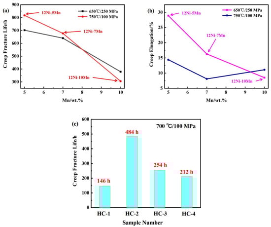 As AFA steel is mainly used in high-temperature and high-pressure environments, creep properties are very important. In order to study the effect of adding Mn on the creep properties of AFA steel, the content of Mn was increased on the basis of 8OC-I (12Ni–5Mn–0.2C). The contents of Ni, Mn, and B in HC series alloys is adjusted based on HC-1 (14Cr–5Mn–12Ni–2.5Al), as can be seen in Table 1 and Figure 5 for details [20,21]. Under the conditions of 650 °C/250 MPa and 750 °C/100 MPa, the creep life greatly decreased with the increase in Mn content. Under the conditions of 750 °C/100 MPa, the creep life decreased from 817 h to 305 h. And the creep elongation decreased from 28.9% to 8.5% at 650 °C/250 MPa.
