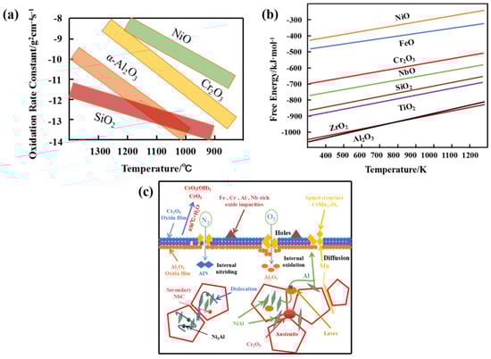 The properties of common oxides changed with temperature and the effect of Mn: (a) oxidation rate constant; (b) free energy [9]; and (c) the mechanism diagram of Mn participating in the formation of oxide film.