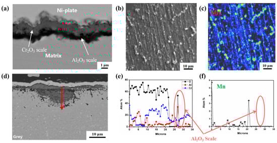 Figure 7 shows the characterization results of the oxide layer on the Mn-added AFA steel. As shown in Figure 7a, AFA steel has a composite structure on the Cr2O3 oxide layer on the outer surface and a thin Al2O3 oxide layer on the inner surface. In Figure 7b,c, the small Mn-rich island-like nodules were formed on the oxide surface of AFA steel because Mn diffused rapidly and reacted with Cr2O3 to produce spinel-like CrMn1.5O4, which is harmful to antioxidant properties. Interestingly, as can be seen from Figure 7d–f, at the site of a higher Al content on the surface oxide layer, the Mn content was 0, indicating that Mn did not affect the compactness of the Al2O3 oxide layer. The oxide layers of AFA steel from the outside to the inside were the oxide layer rich in the Fe, Cr, and Mn, the oxide layer rich in Cr2O3, and the oxide layer rich in Al2O3, respectively [10]. This is related to oxygen activity, which is the lowest required for Al oxidation [43]. In addition, Mn and Fe have a high solubility in the Cr2O3 oxide layer and thus can easily diffuse to the surface through the Cr2O3 oxide layer. However, once the Al2O3 oxide layer formed, the flux of O2 diffusion inward through the oxide layer and Mn diffusion to the surface will be greatly reduced [10,43]. Therefore, it is worth investigating the relationship between Mn enrichment and the formation of alumina film.