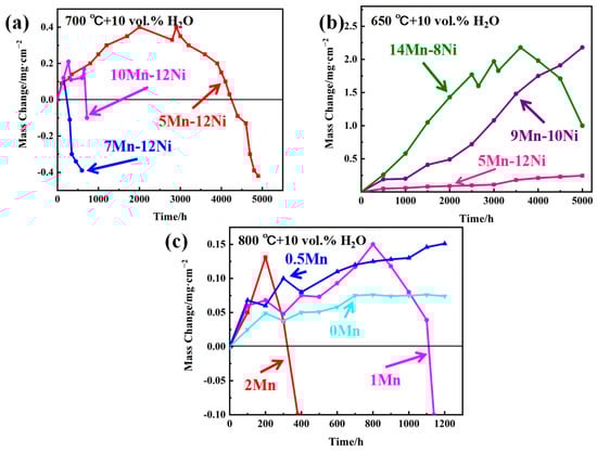 Weight gain curves of several AFA steels with Mn content: (a) 700 °C + 10 vol.% H2O; (b) 650 °C + 10 vol.% H2O; and (c) 800 °C + 10 vol.% H2O [9,20,21].